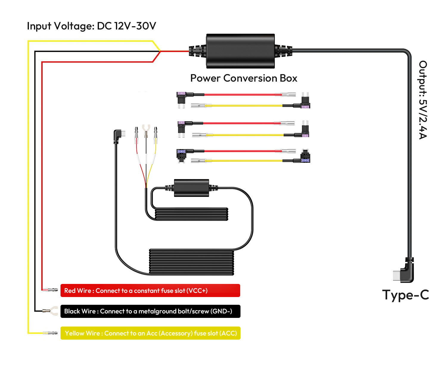 Ce kit hardwire USB-C à 3 fils de Botslab est une alimentation intelligente pour toutes les dashcams Botslab dotées d'un port USB-C (HK30 Pro, G500H Pro, G980H Pro, V9H, etc.). Cette alimentation peut être connectée à la boîte à fusibles de la voiture pour alimenter la dashcam lorsque le contact est coupé. L'alimentation électrique Botslab est livrée avec les quatre types de porte-fusibles, ce qui rend l'installation très simple et sûre.