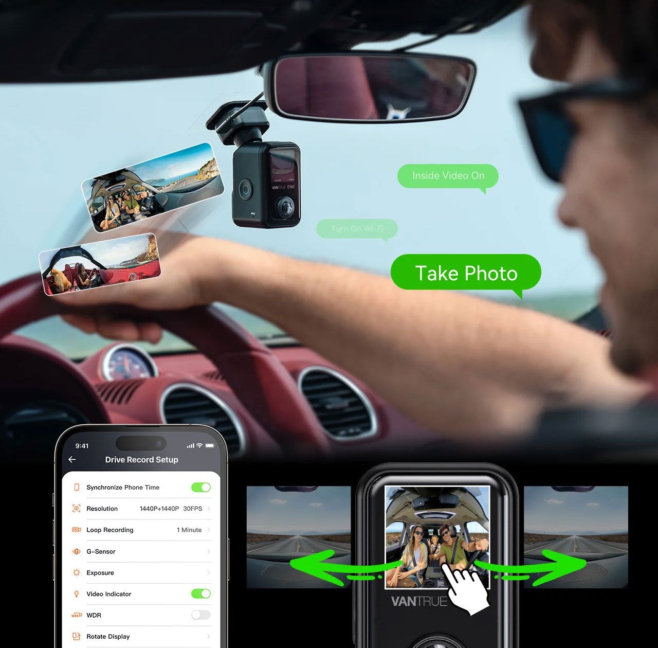Comme la Vantrue E360 Plus est équipée de 3 caméras, tout ce qui se passe dans et autour de la voiture est enregistré. La caméra avant (155˚), la caméra intérieure (160˚) et la caméra arrière (165˚) vous permettent de ne rien manquer.